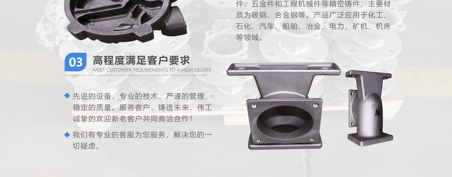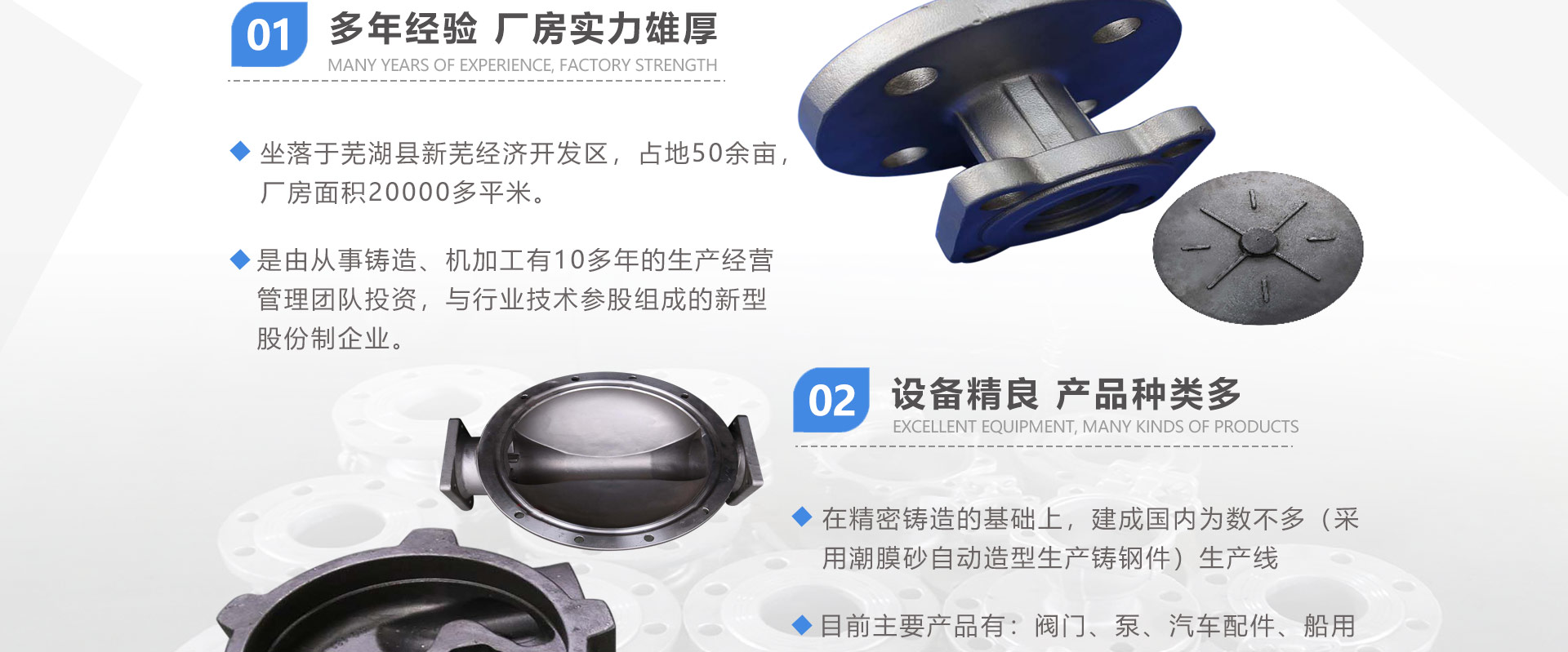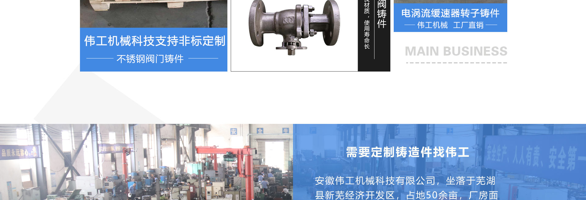 安徽偉工機械科技有限公司,坐落于安徽蕪湖新蕪經濟開發(fā)區(qū),是一家専業(yè)從事鑄造產品設計、研發(fā)、生產、銷售于一體的企業(yè),公司為客戶的產品提供多樣的技術支持與設計,公司主要鑄造技術有潮模砂鑄造、硅溶膠精鑄工藝。主要產品有:不銹鋼閥門配件、泵閥配件、汽車配件、工業(yè)管道配件、工程機械配件、汽車配件等。材質為:低合金鋼、304、316、316L、鉻鉬鋼、哈氏合金、碳鋼、雙相鋼等。公司已先后通過ISO9001和TS16949等多種體系審核,以完備的管理手段和齊全的檢測設備滿足客戶需求,進的設備,専業(yè)的技術,嚴謹?shù)墓芾恚€(wěn)定的質量。服務客戶,鑄造未來,偉工誠摯的歡迎新老客戶共同商洽合作